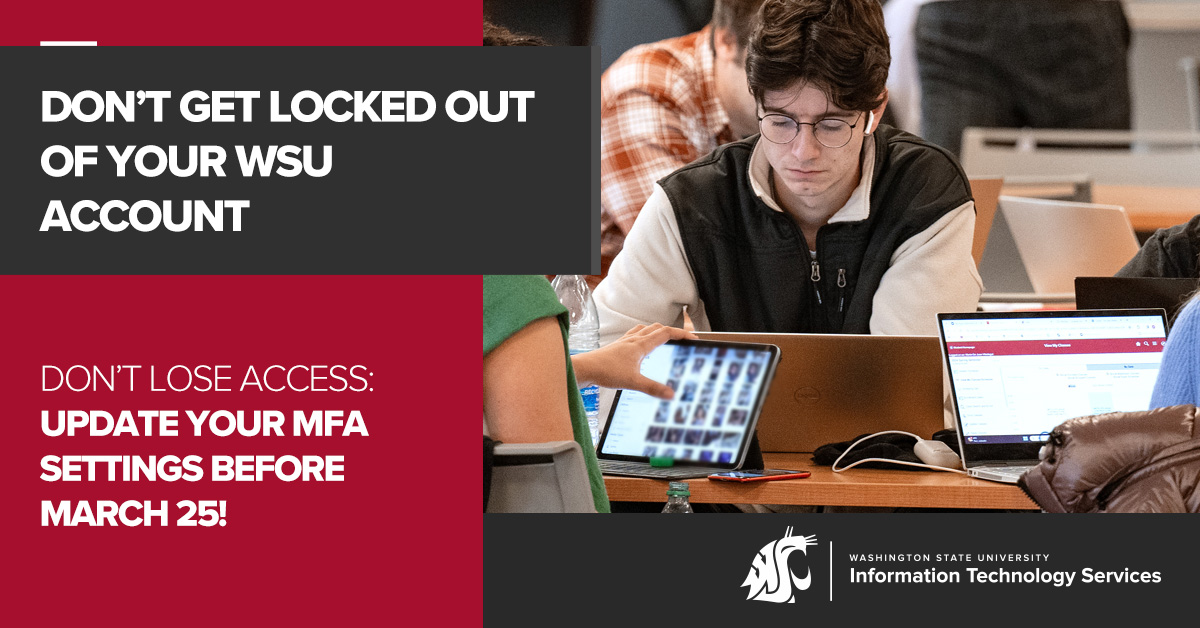 Multi-Factor Authentication (MFA) will be required at login for more WSU applications, including Blackboard, Adobe, Cougar Card, Zoom and others, beginning at 6 a.m. on March 16. Users should check with local technical support for any department-specific applications that may be affected.